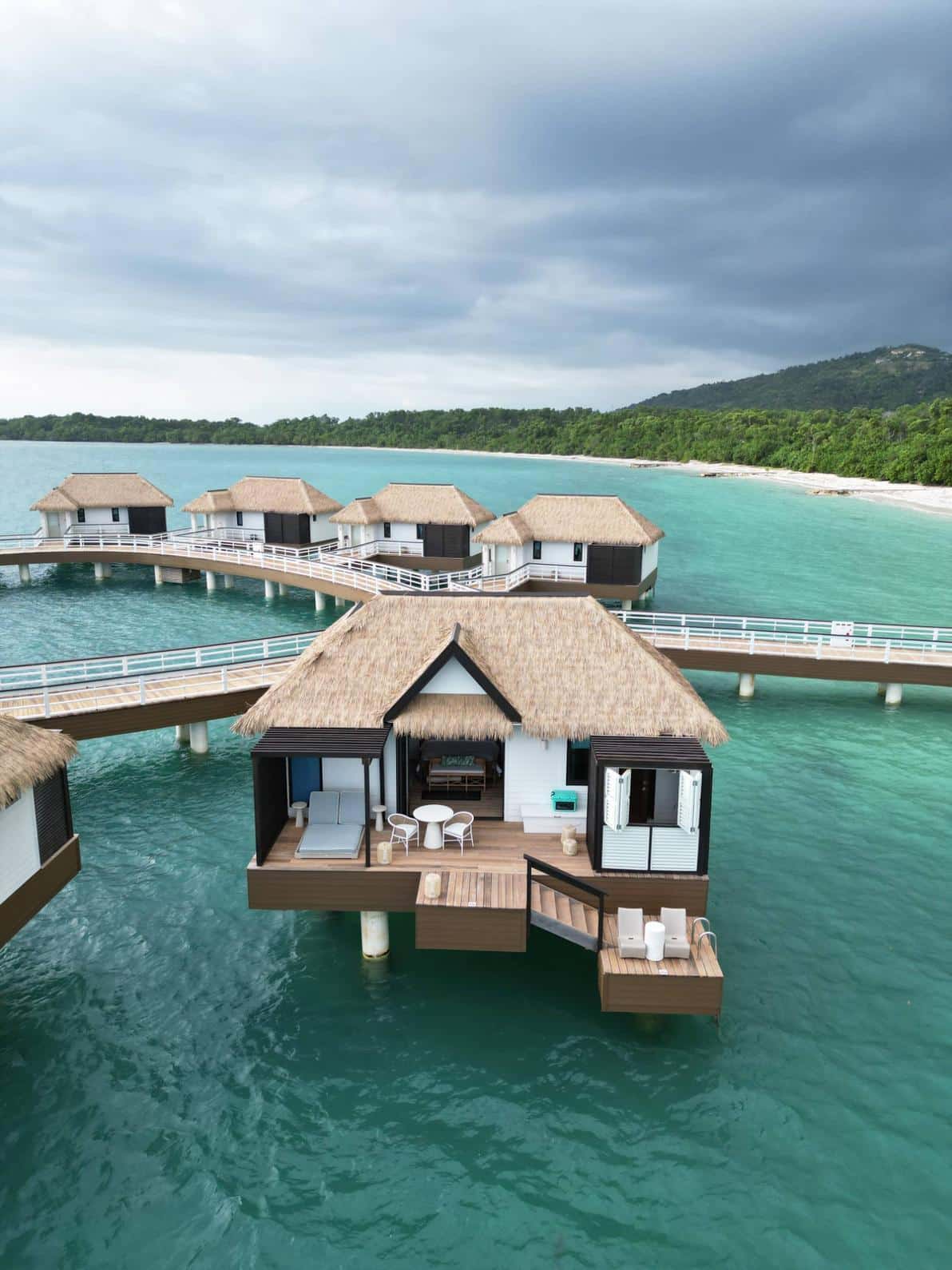 - The overwater bungalows are set on a private island, accessible only by boat.