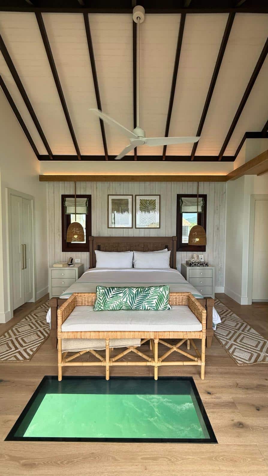 Expect tranquility soaking tubs for two, outdoor shower, panoramic ocean views, spa-inspired bathrooms, sea through glass floors, private outdoor tranquility, glass floor panels (where you may spot a trumpet fish or a stingray gliding below in the underwater world), and your overwater hammock.